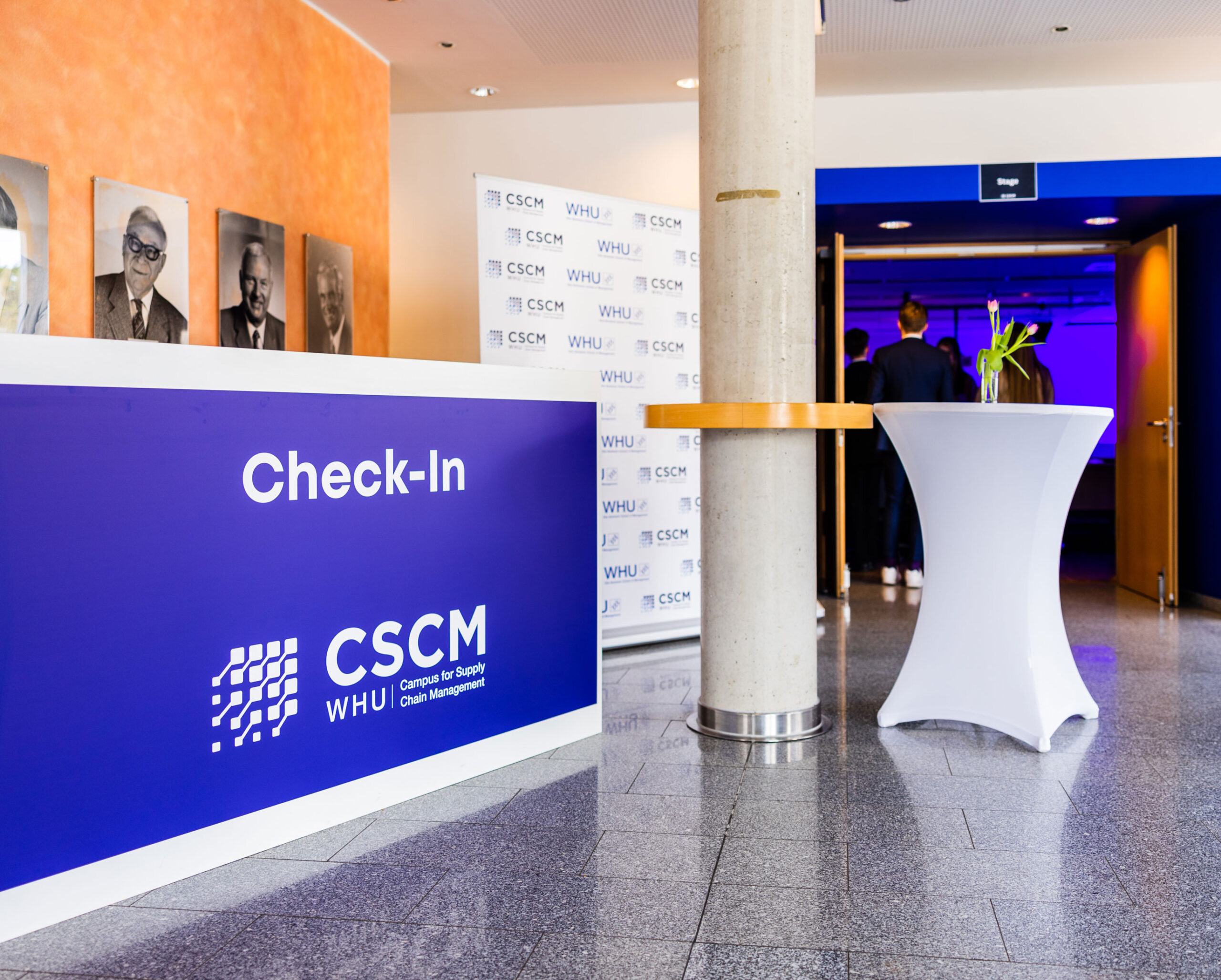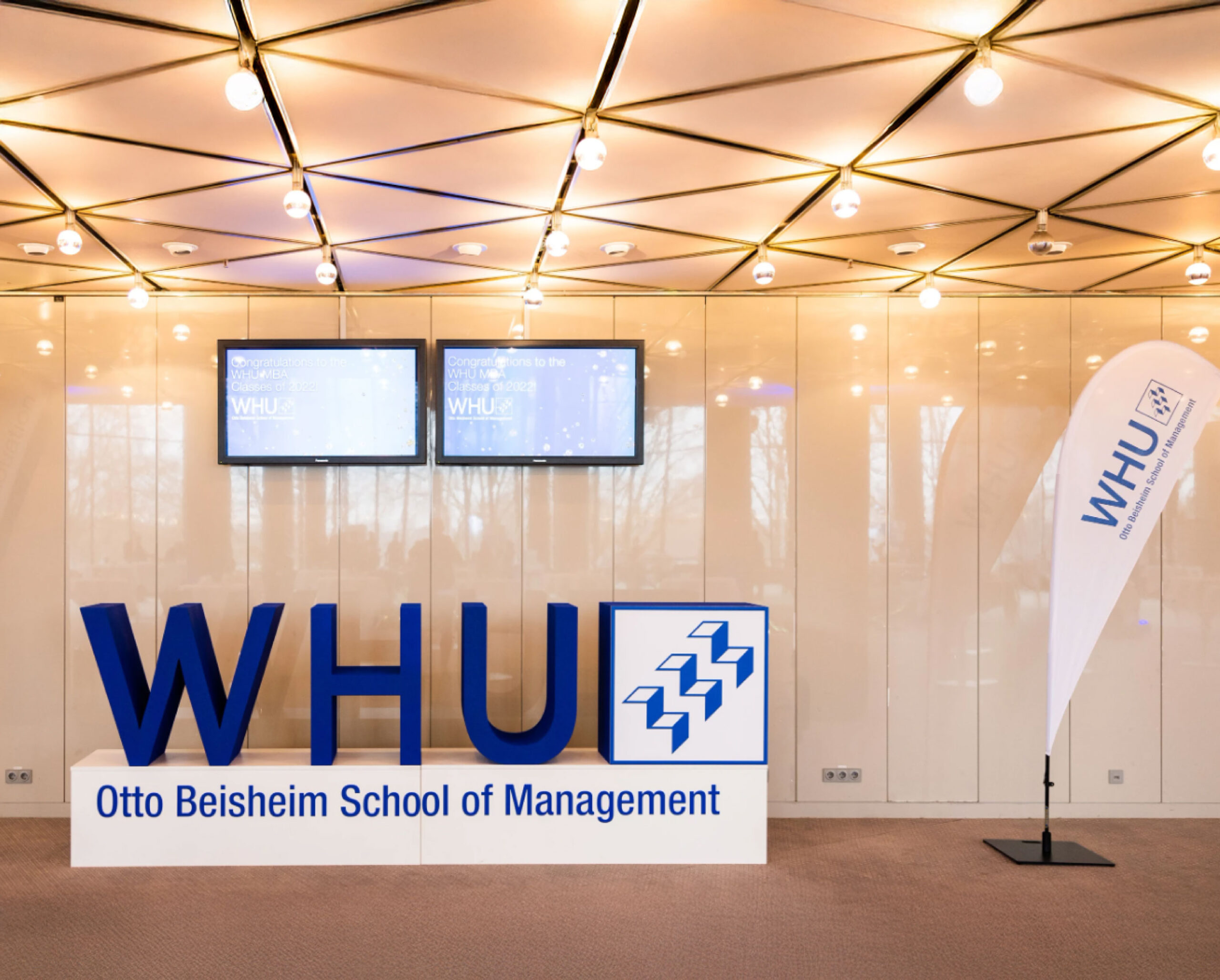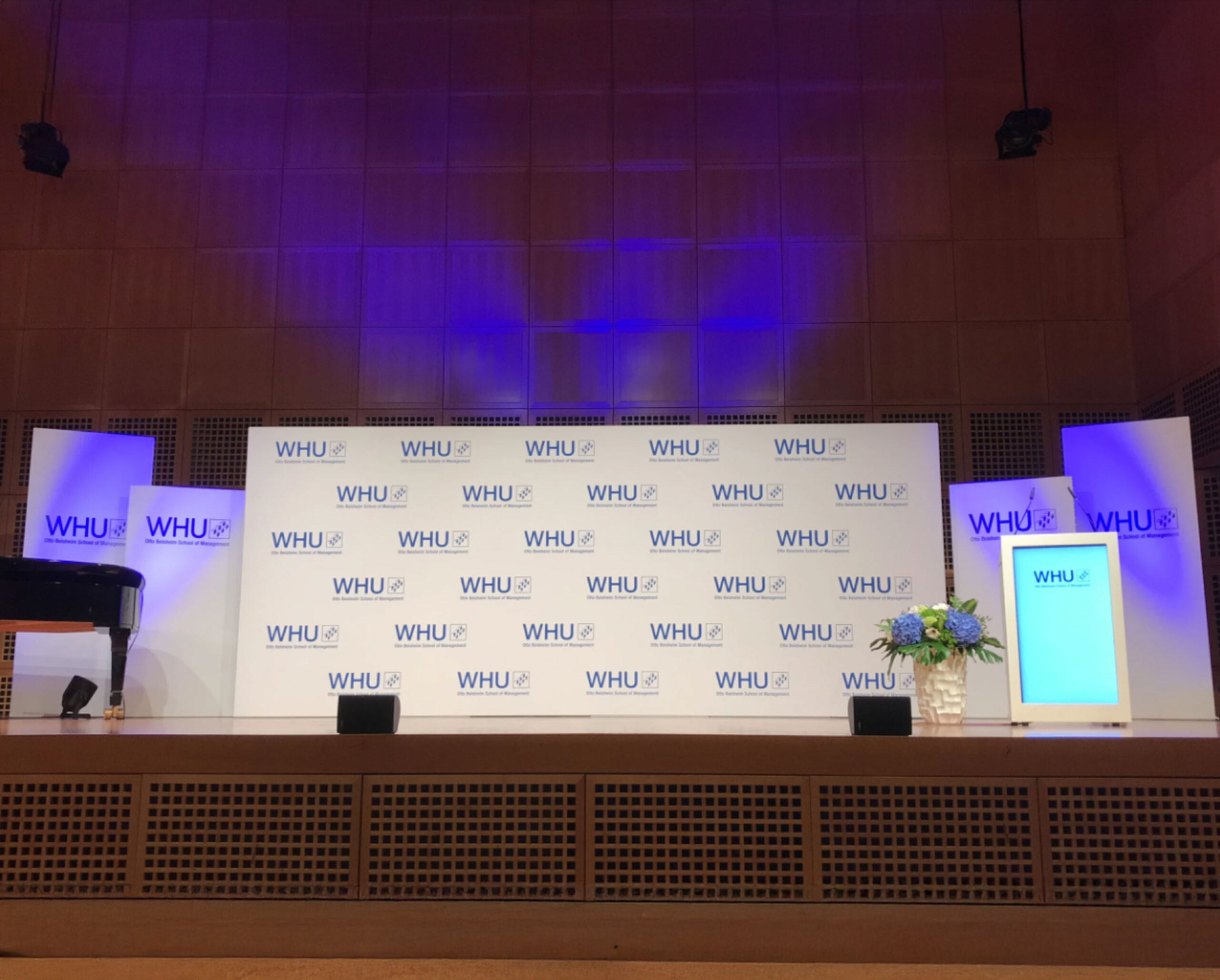 For events such as larger conferences, our Branding Package M includes the branding corner, beach flags, and pop-up counter, as well as WHU panels. A logo wall for a stage and a check-in desk also offer a co-branded option if the event is in collaboration with WHU.