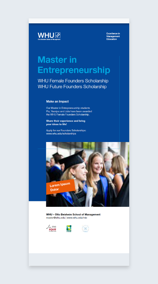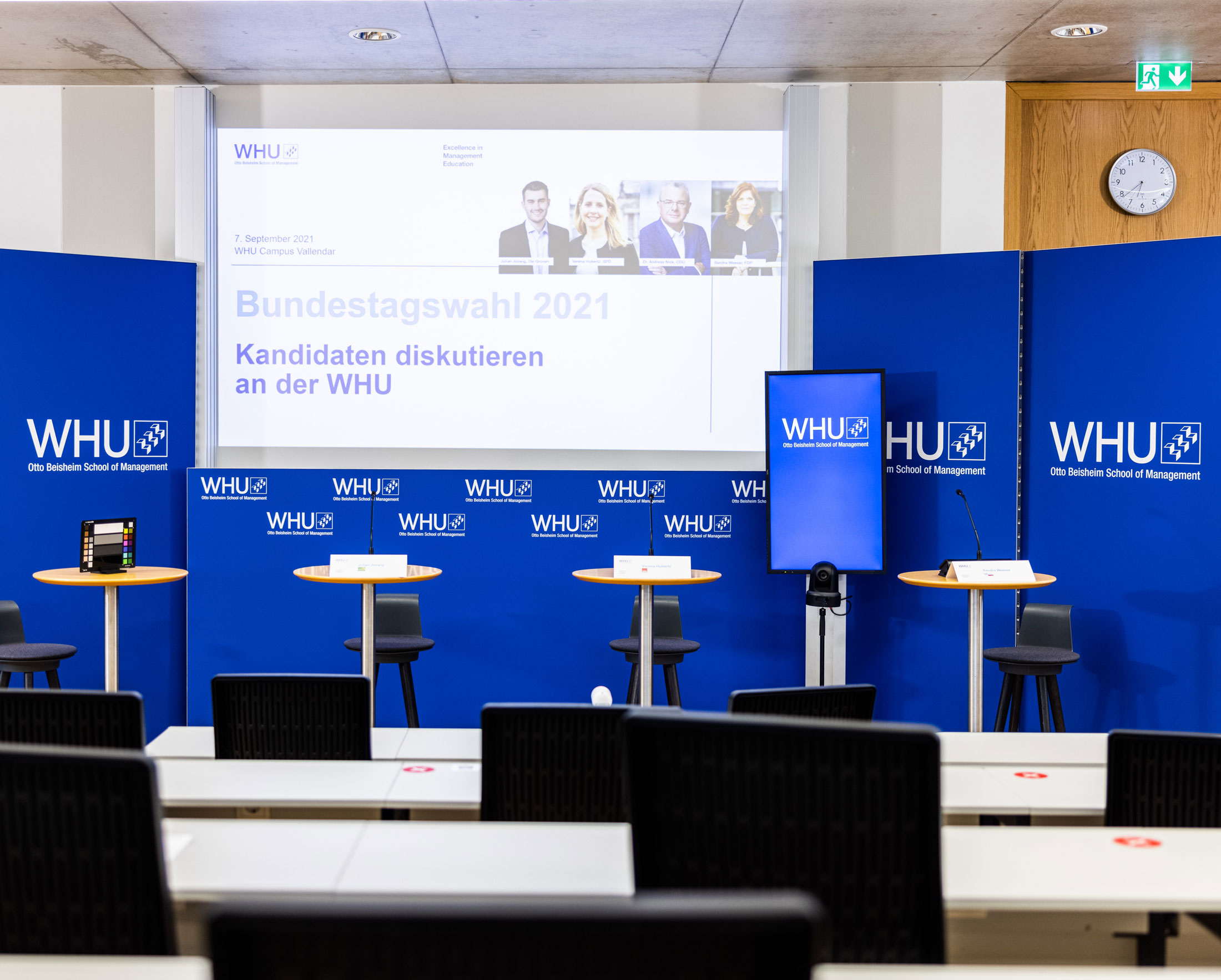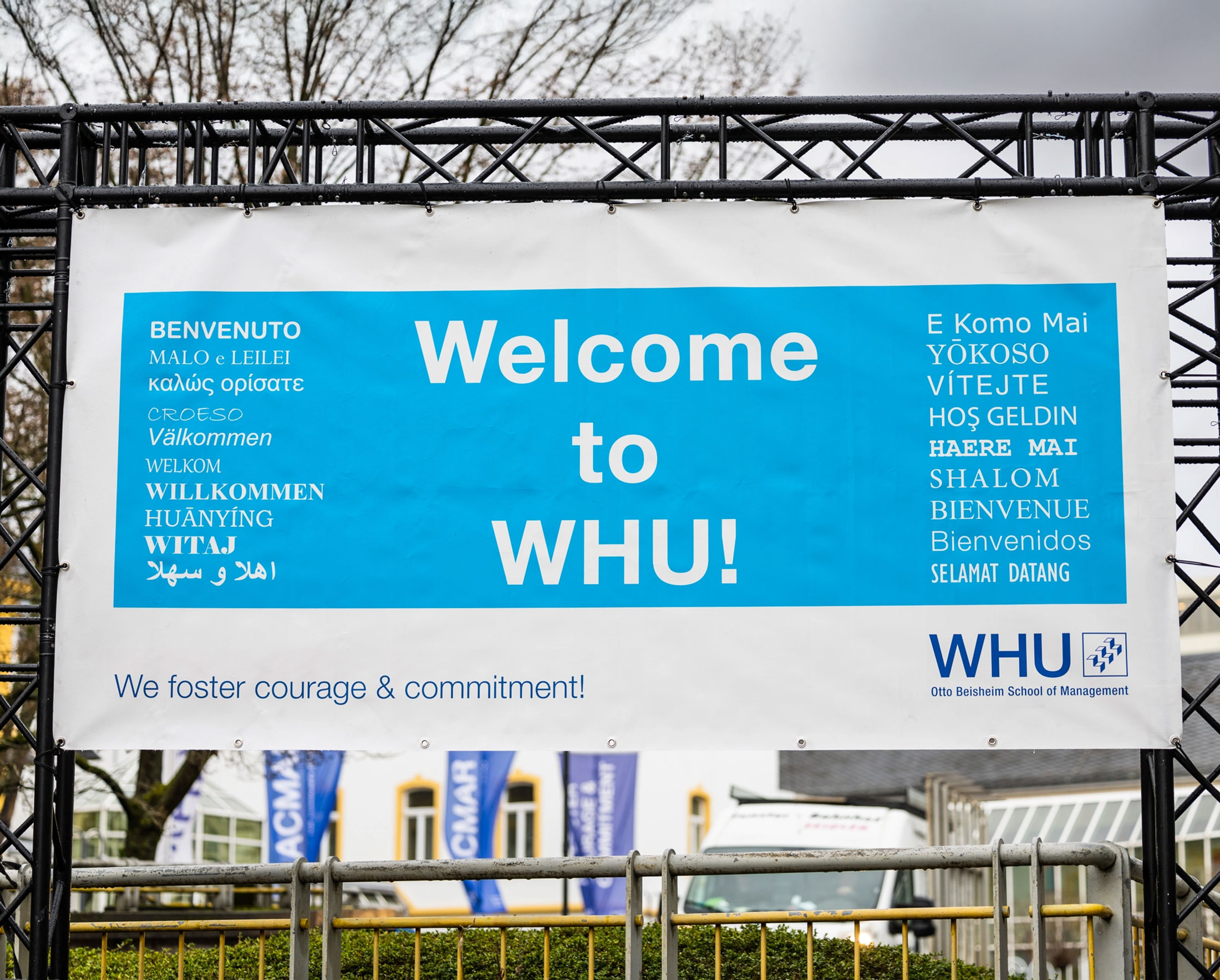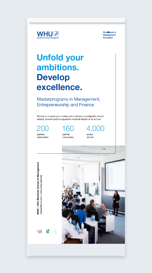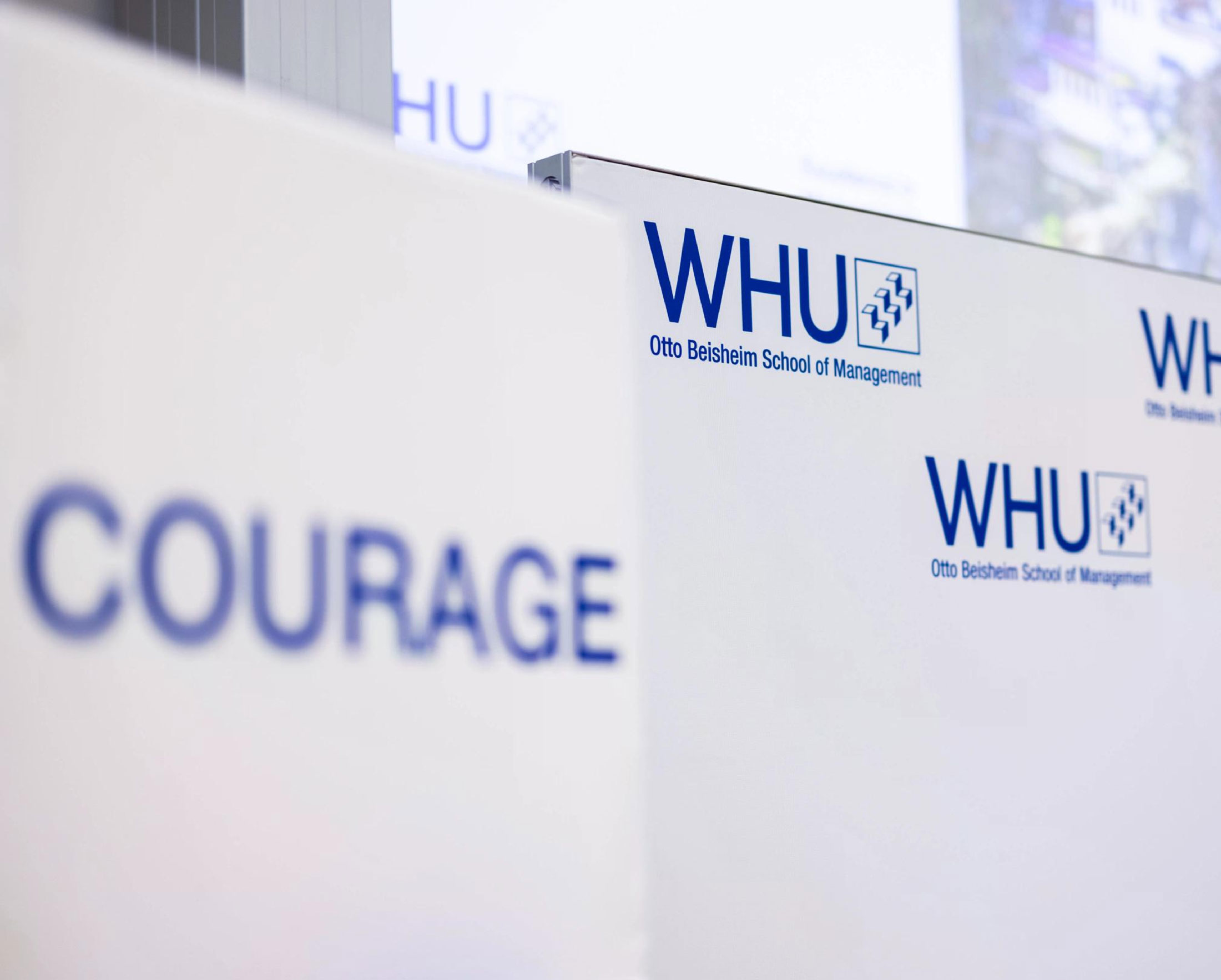 For events such as larger conferences, our Branding Package M includes the branding corner, beach flags, and pop-up counter, as well as WHU panels. A logo wall for a stage and a check-in desk also offer a co-branded option if the event is in collaboration with WHU.