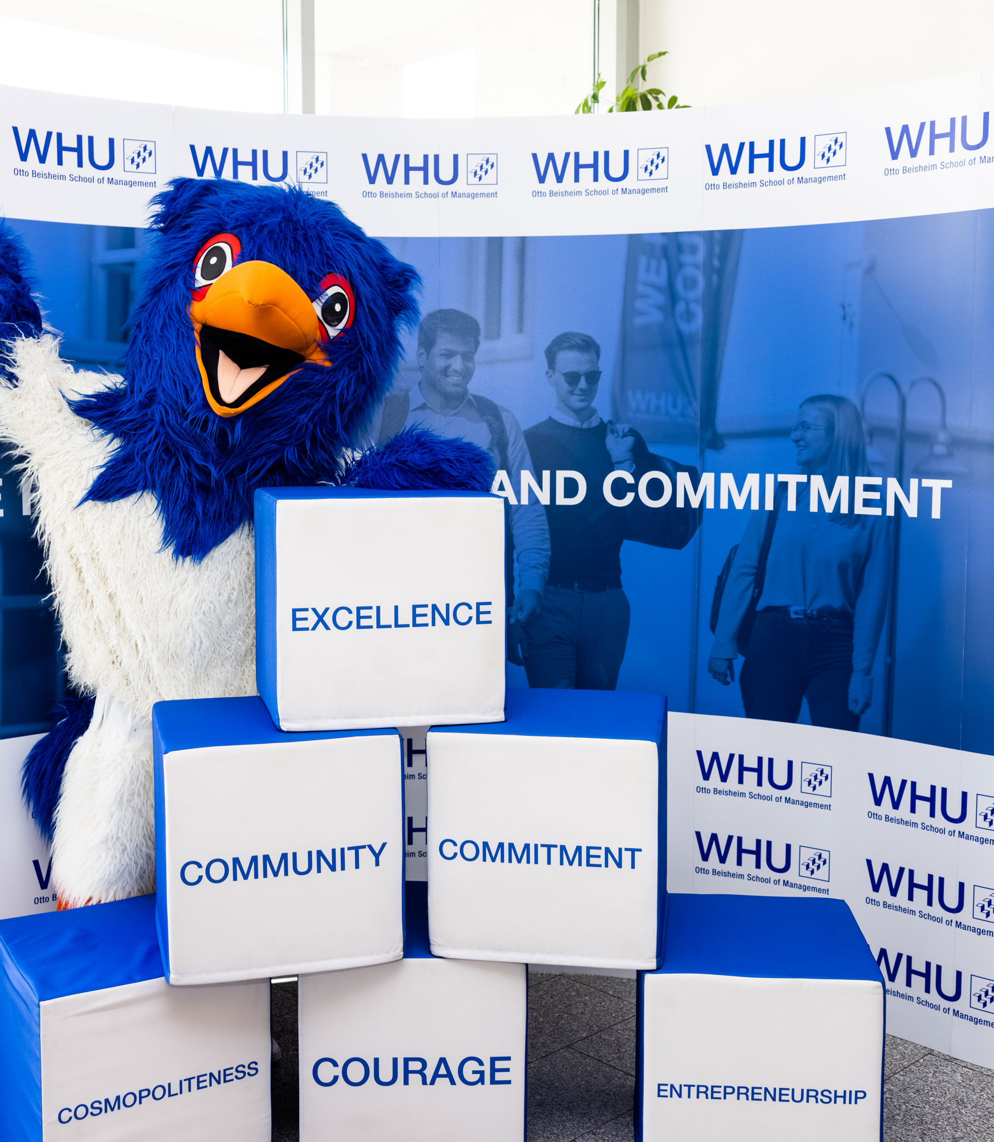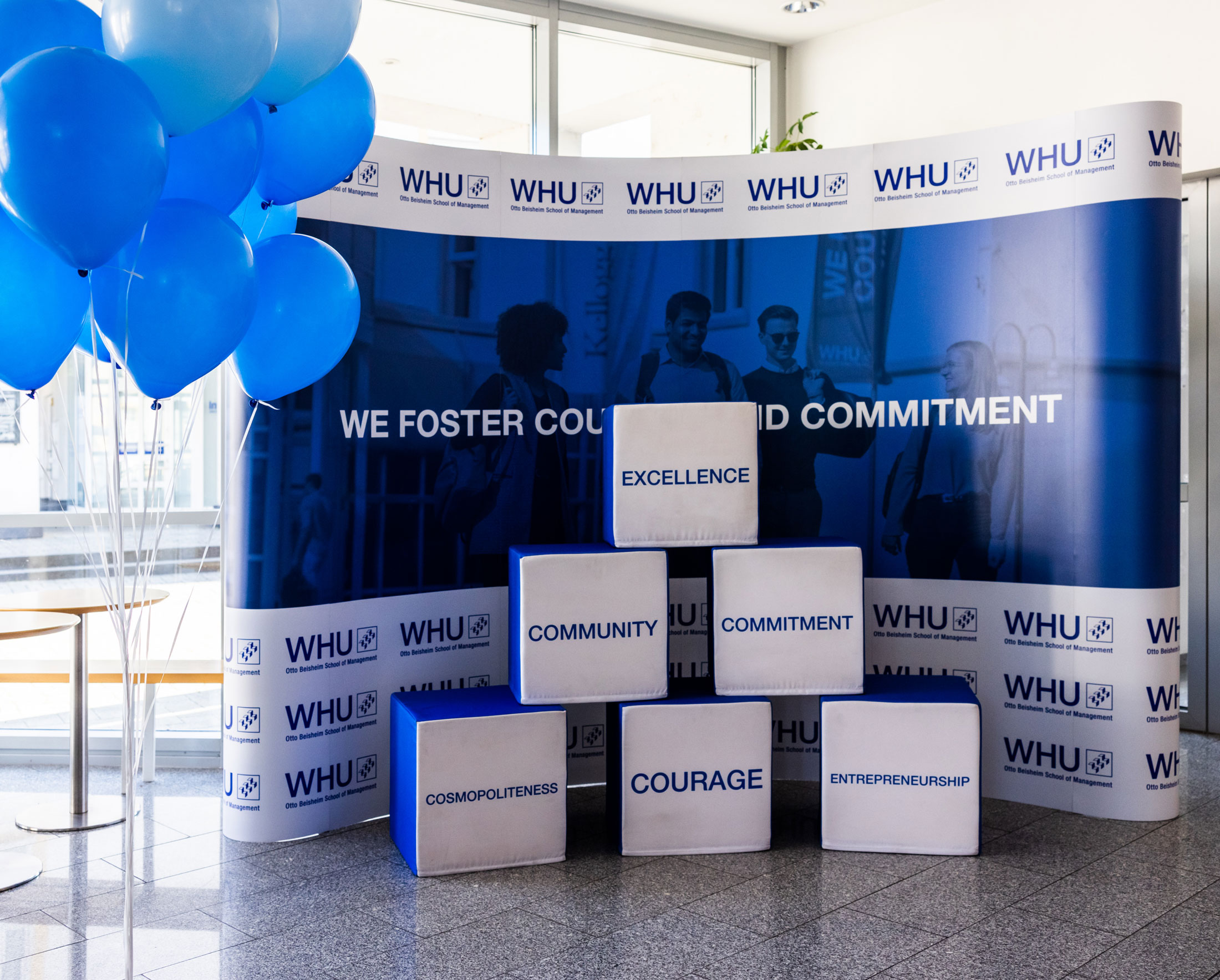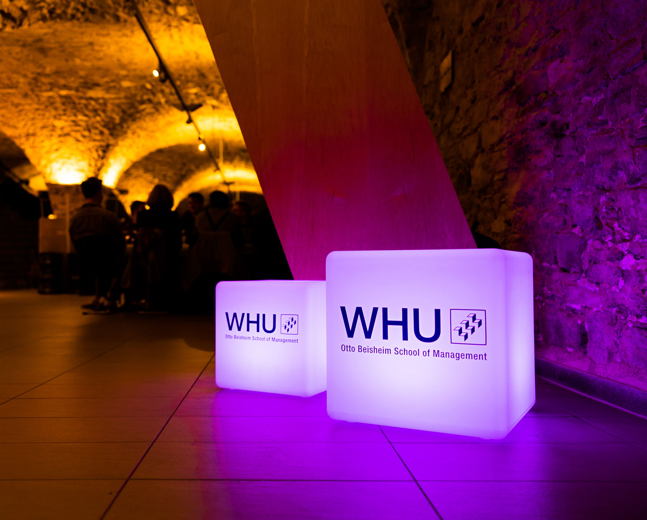 Our smaller package of branding items includes the branding corner with the WHU logo or the WHU values and our LED cubes, beach flags, roll ups, and pop-up counter.