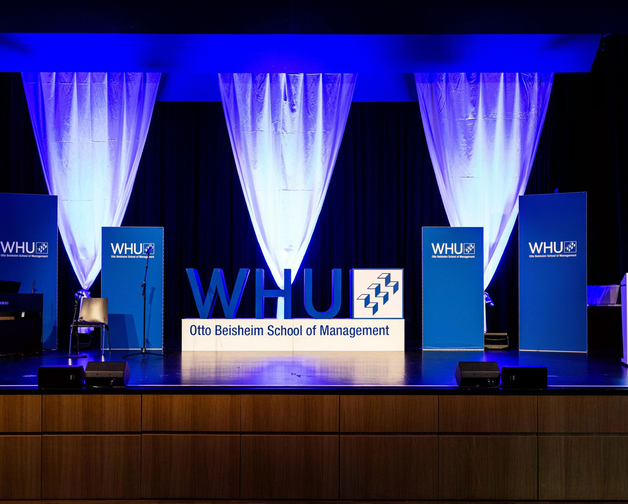 Our largest option includes the basic items, such as the branding corner and beach flags, along with larger physical elements, including hanging banners, the WHU logo as a 3D feature, and a speaker podium with a digital screen. This setup is ideal for large-scale events such as graduations.